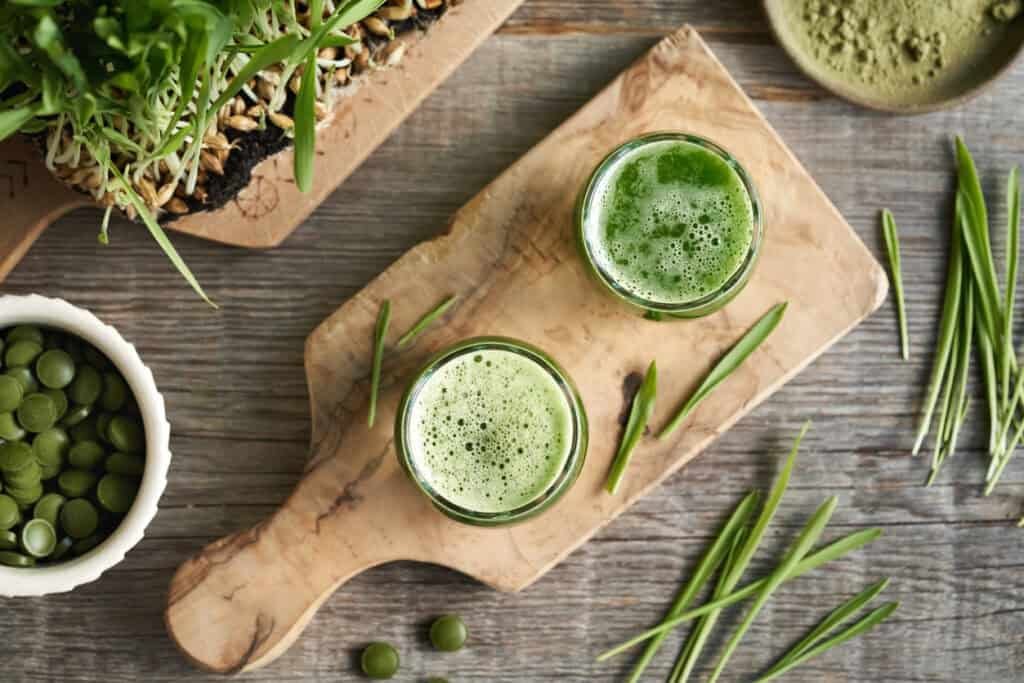 Two glasses of homemade barley grass juice with freshly grown barleygrass blades, powder and tablets